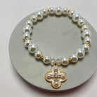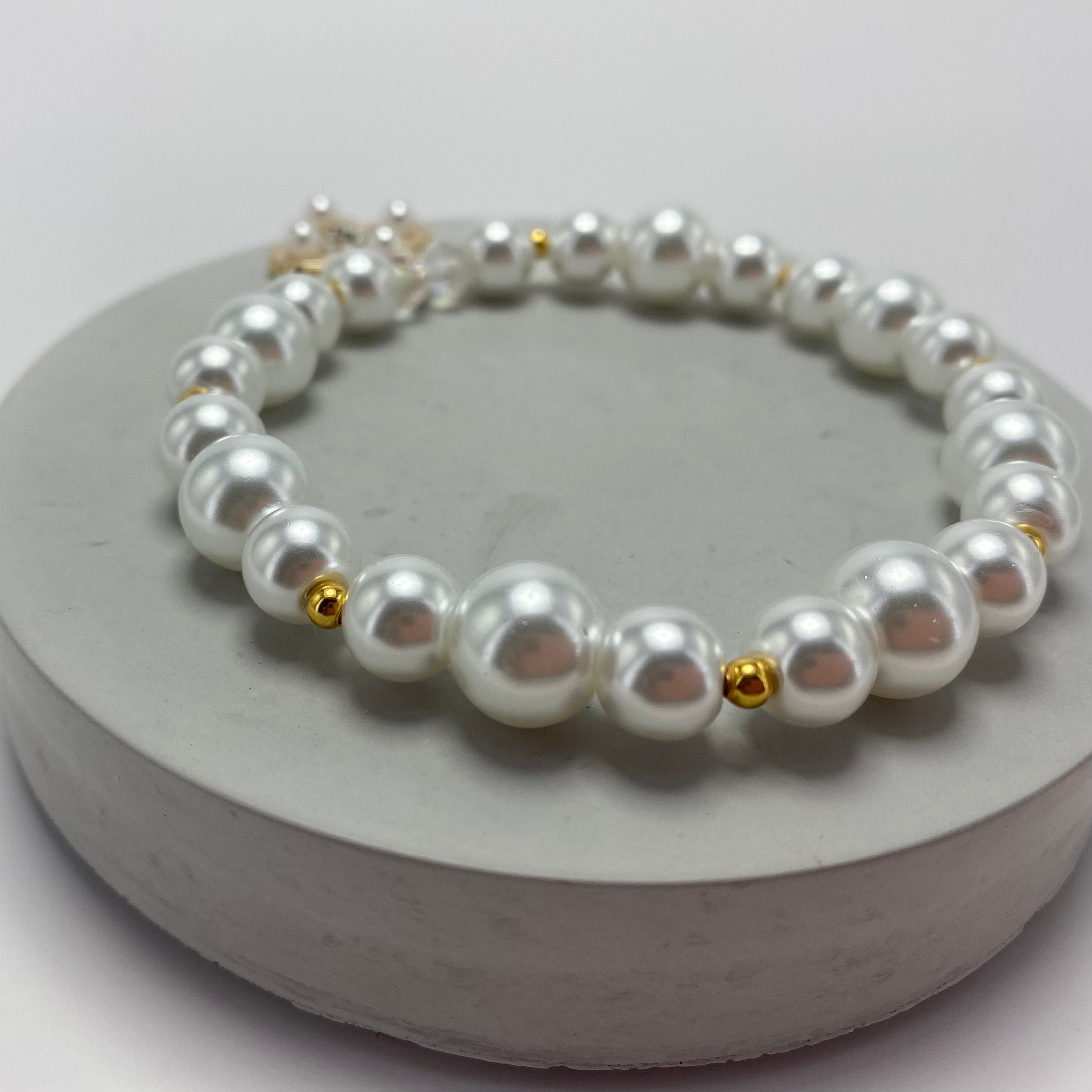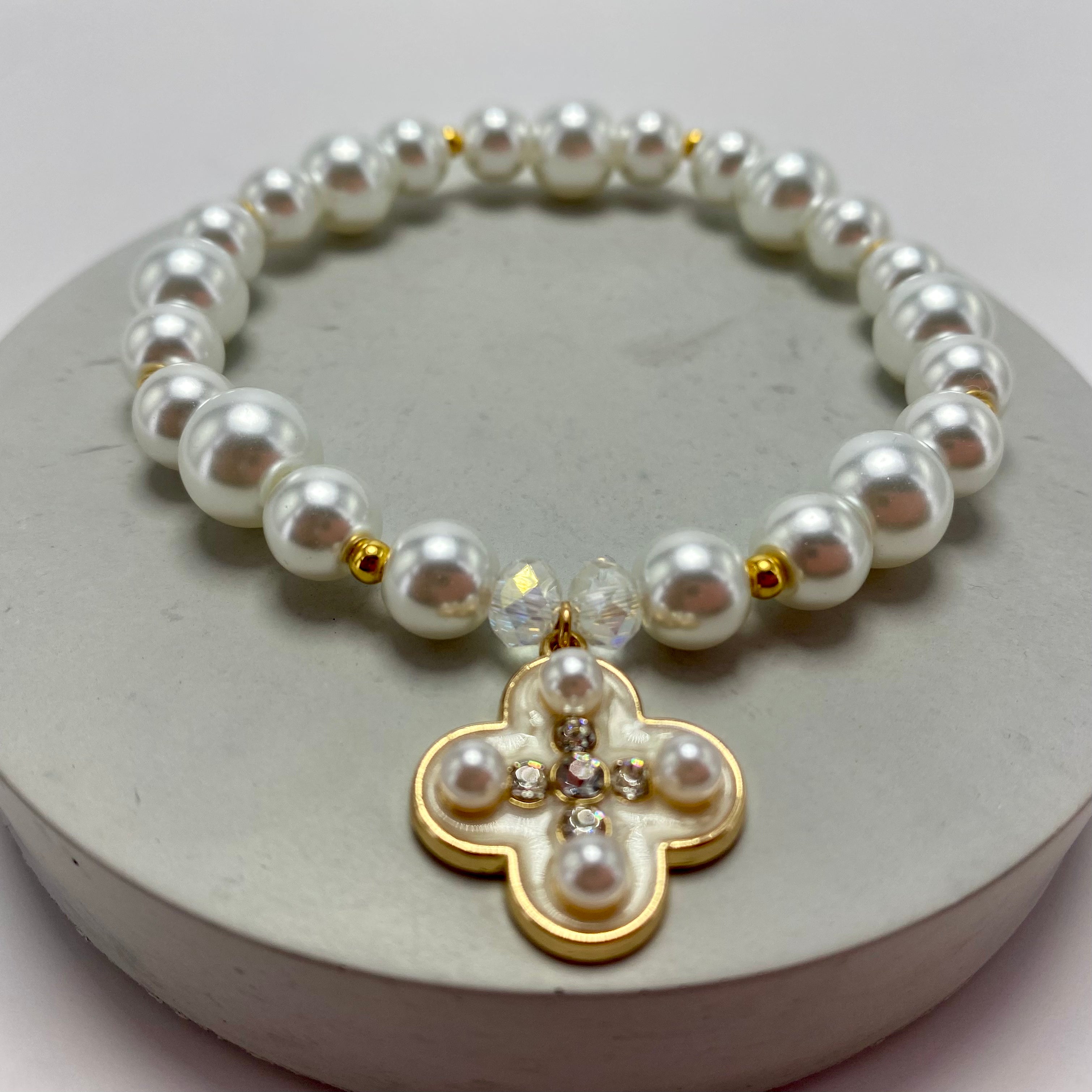 I made this darling bracelet using white glass pearls, clear glass rondelle beads and 18k gold plated spacer beads. I added a clover shaped charm that has a tiny pearl in each corner with a rhinestone lined center.