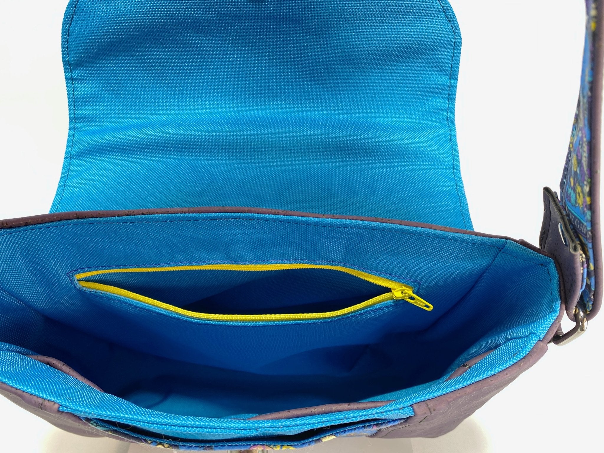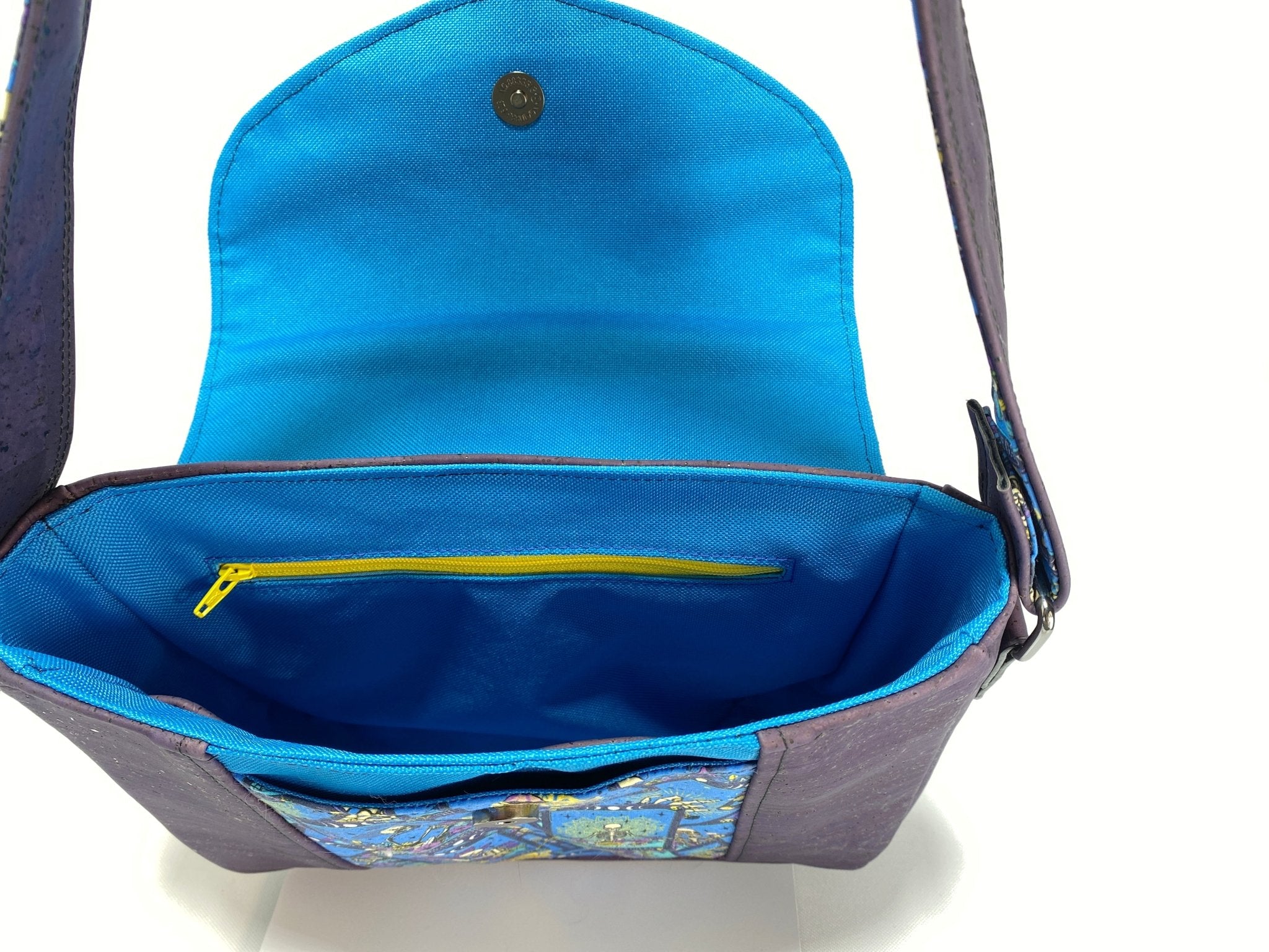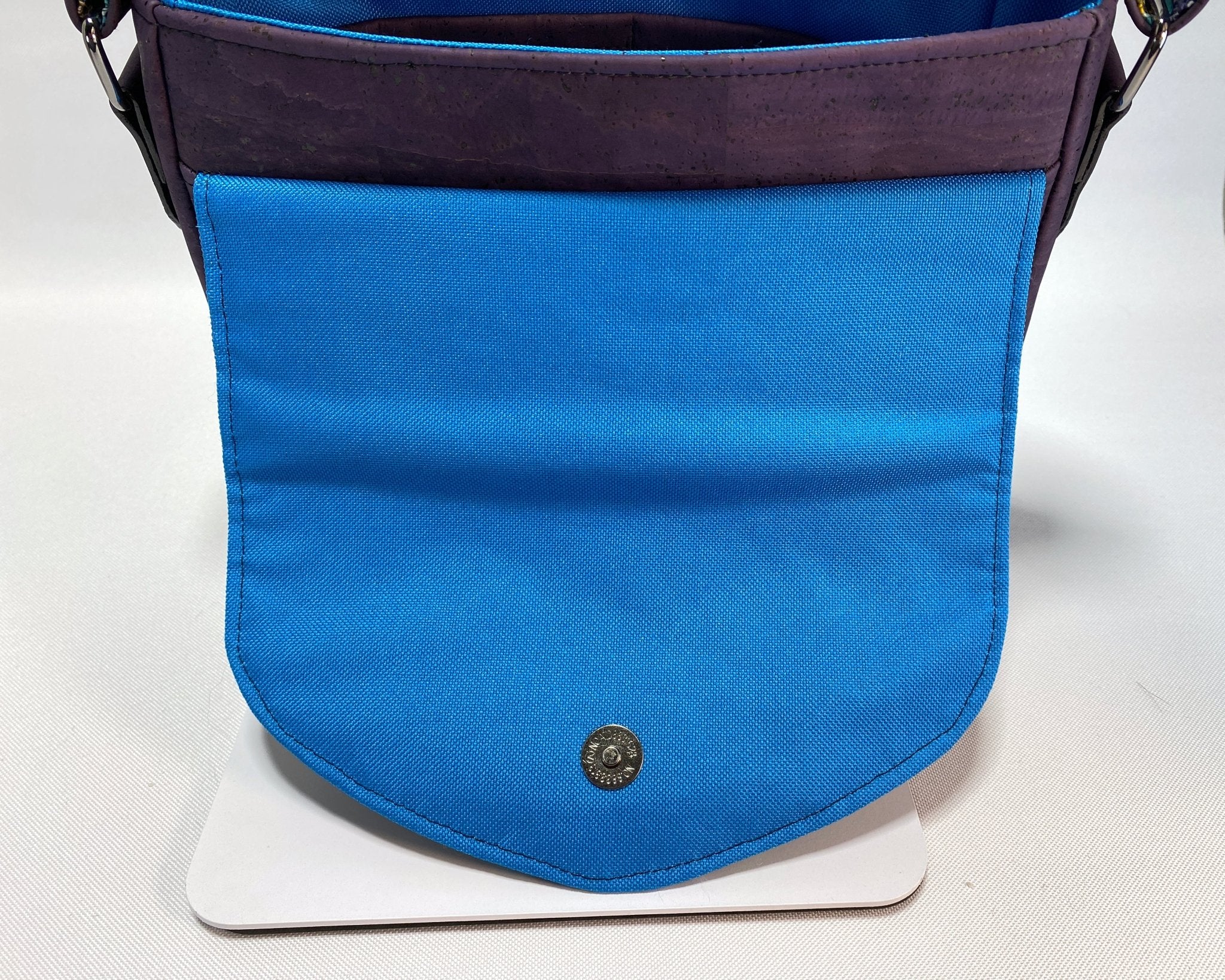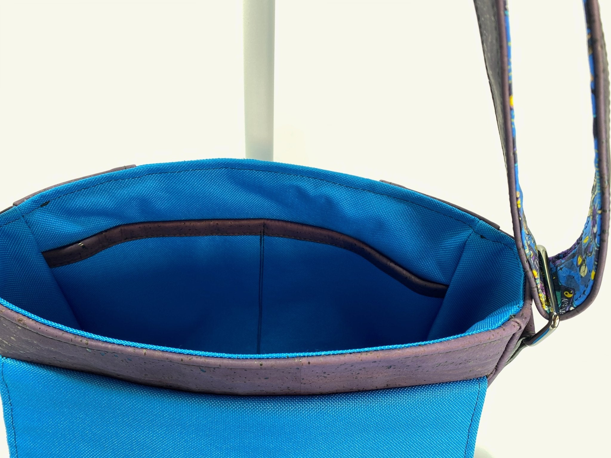 This Esme is an fun crossbody bag that is perfect for everyday use. She is compact but still has plenty of room for your essentials. I made this one using a deep rich Eggplant purple toned cork fabric along with a skeleton tarot card print quilting cotton for the outside. I used a blue waterproof canvas the lining.