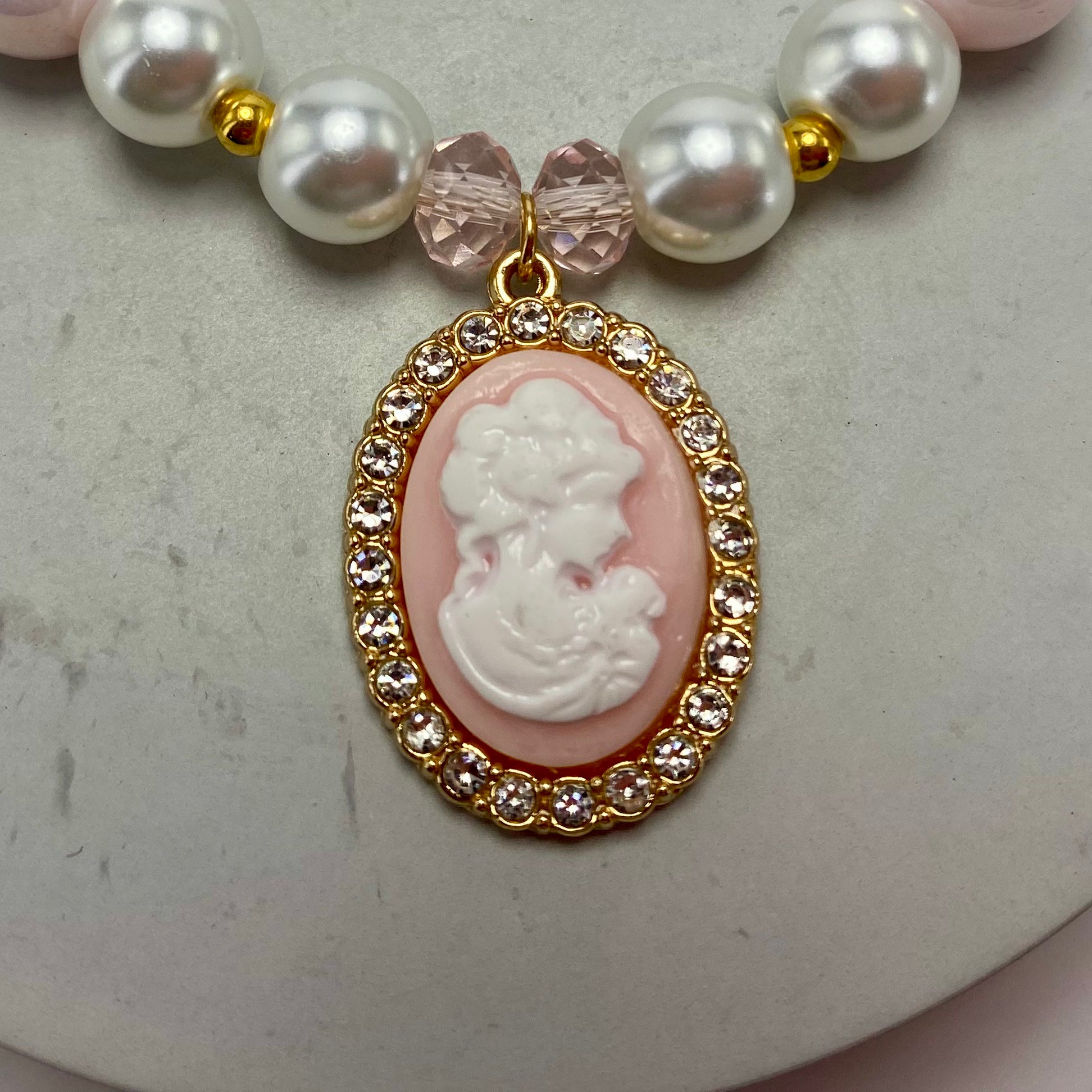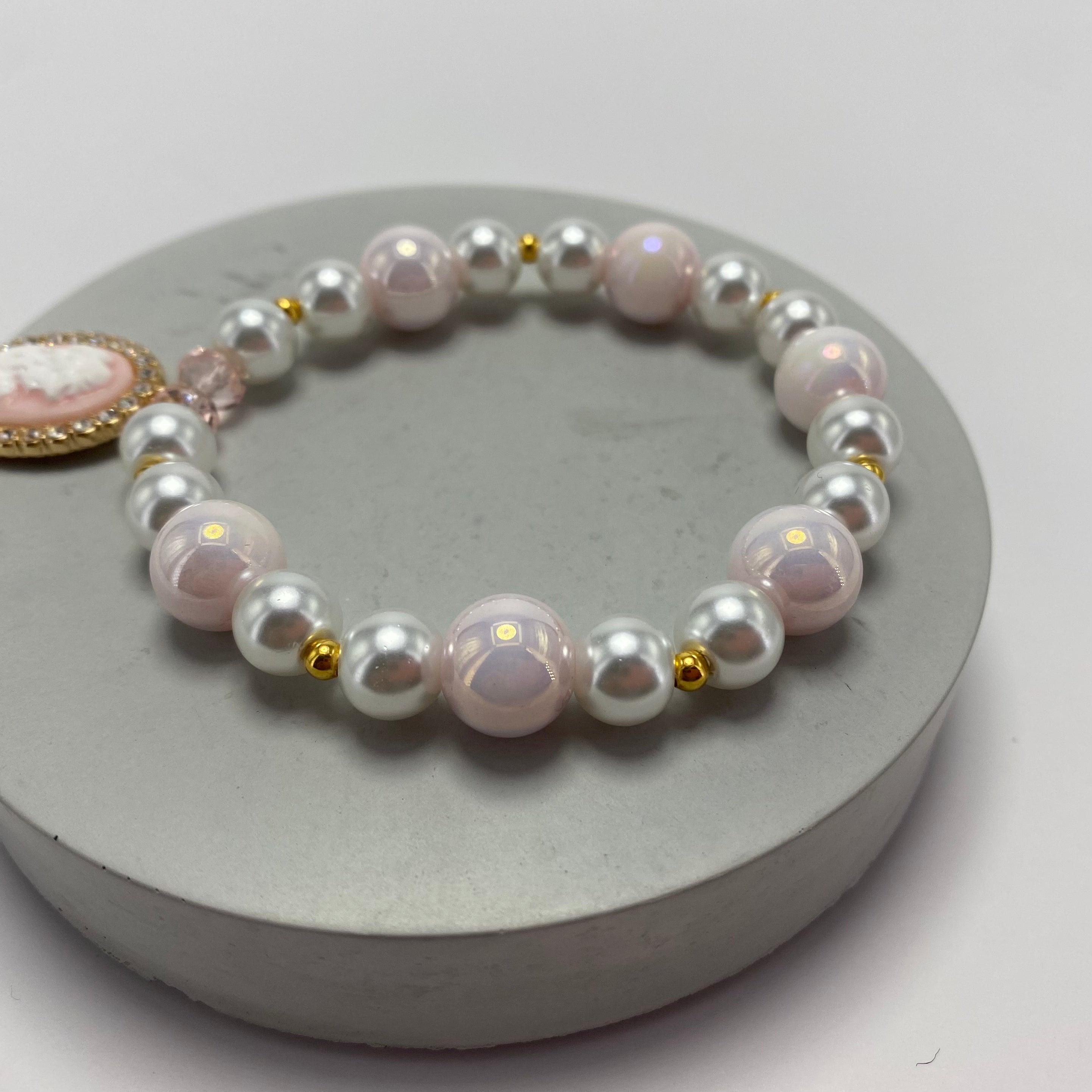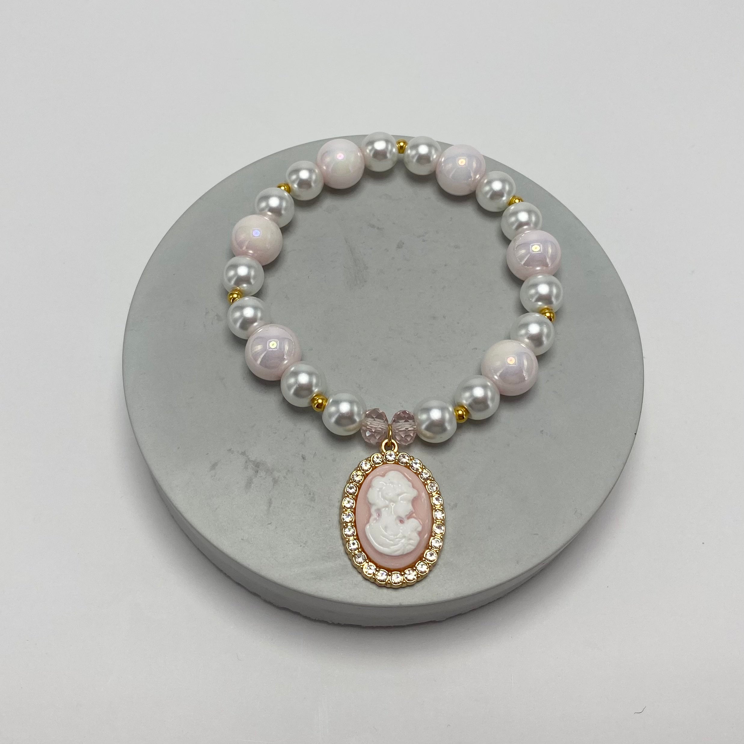 I made this darling bracelet using white and pink glass pearls, light pink rondelle glass beads, and 18k gold plated spacer beads. I added a pink and white cameo charm that is lined with clear rhinestones.
